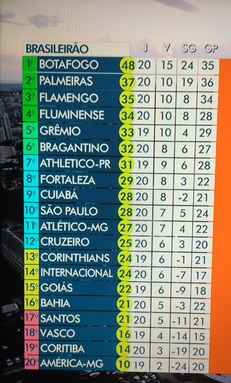 Tabela atualizada da Série A após os jogos de domingo (20) da 20ª rodada