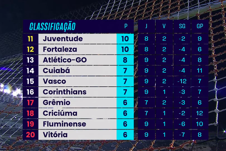 Tabela atualizada da Série A após os jogos deste domingo da 9ª rodada