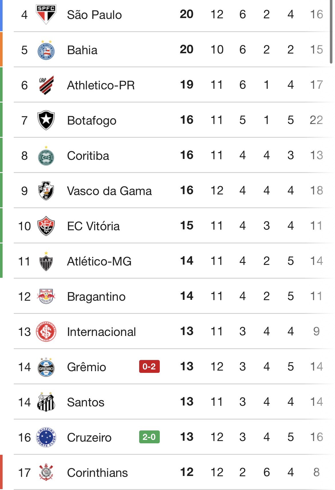 Tabela atualizada da Série A após os jogos deste sábado (18) da 12ª rodada