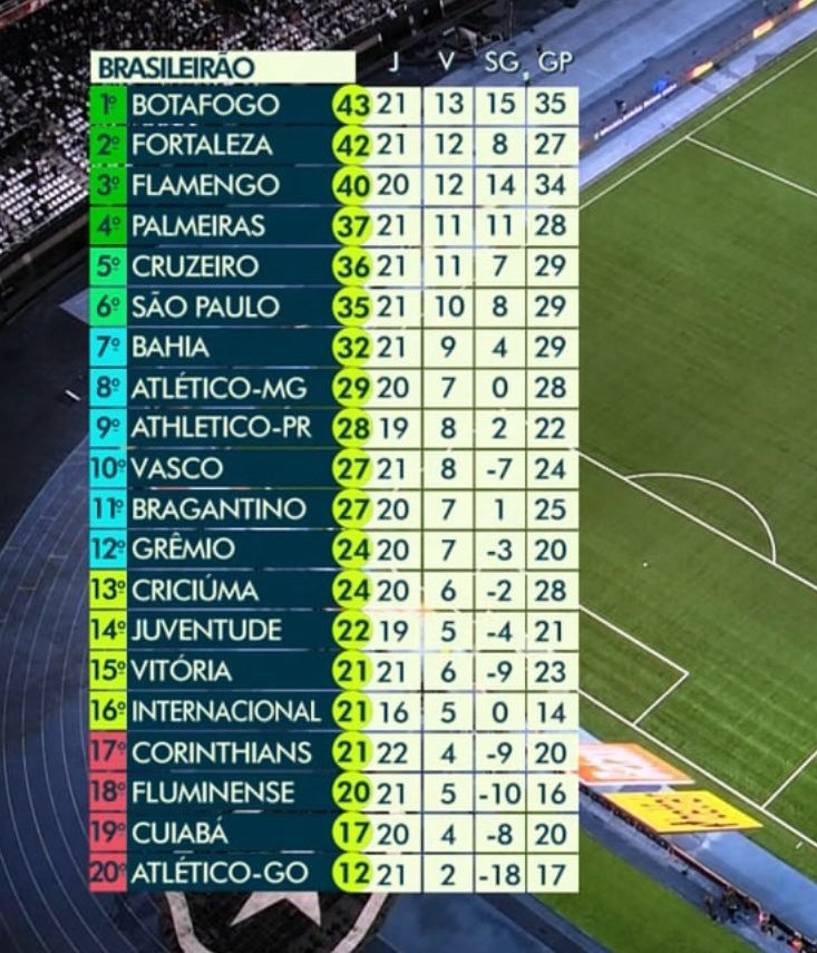 Tabela atualizada da Série A após os jogos deste sábado da 22ª rodada