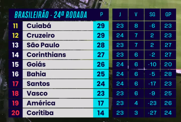 Tabela atualizada do Brasileiro após jogos da última quinta (21)