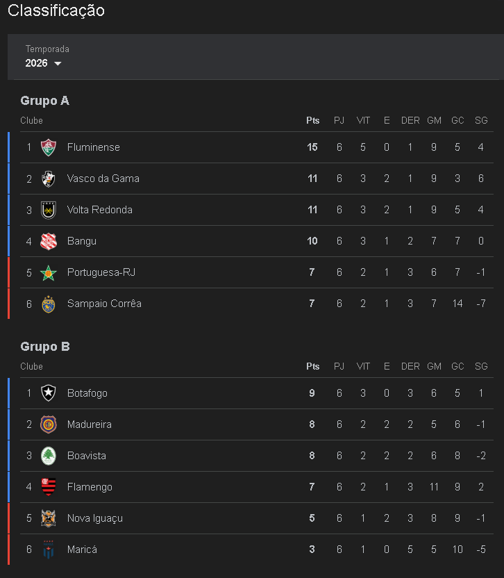 Tabela atualizada do Carioca após o término da fase de grupos