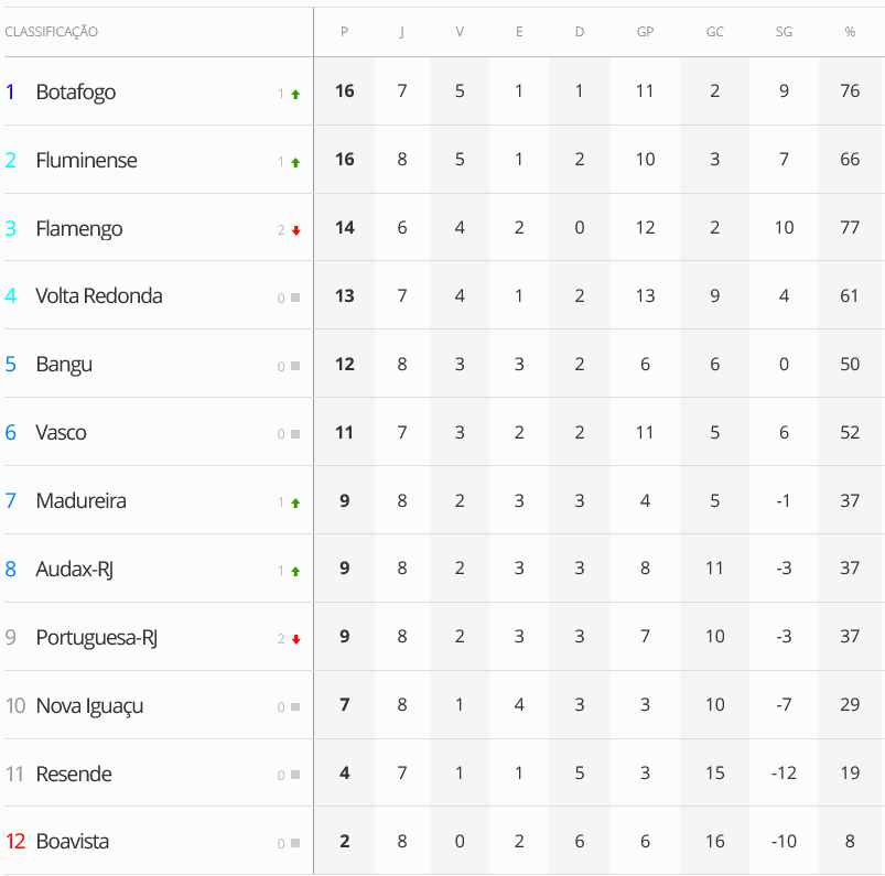 Tabela atualizada do Carioca após os jogos deste domingo (12) da 8ª rodada