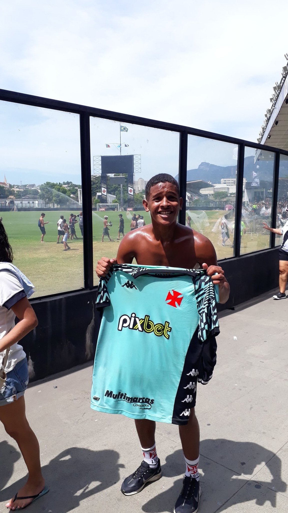 O Pedro conseguiu a camisa do goleiro Thiago Rodrigues aqui em São Januário.