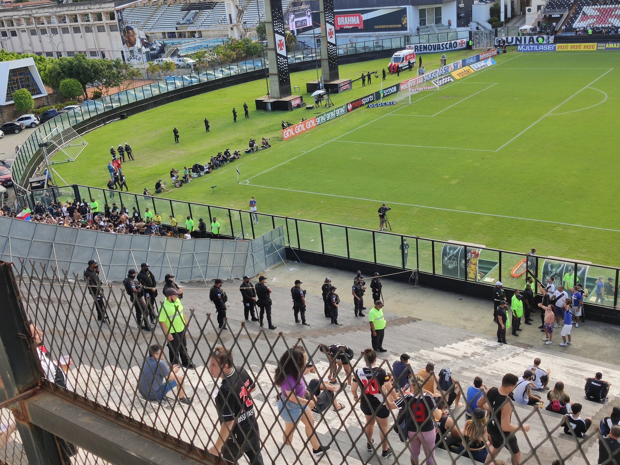 Começou cedo, a confusão em São Januário. Bombas estouram no lado de fora; dentro dele, uma mulher invade o gramado e corre na direção do vestiário. Correria no setor atrás do gol, com polícia e seguranças agindo com violência. Já vimos esse vídeo antes. Triste.