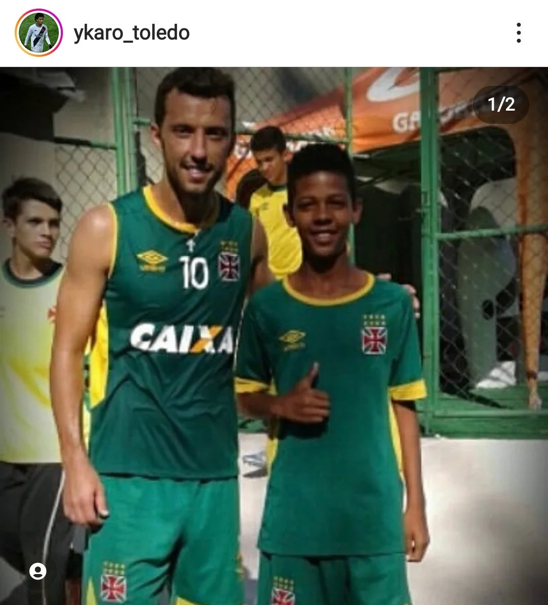 Isso aqui é MUITO maneiro! Atacante @ToledoYkaro da base treinou com os profissionais. Ele postou uma foto antiga com @Nene10 e agora uma atual. Parabéns, garoto! Você tem talento!