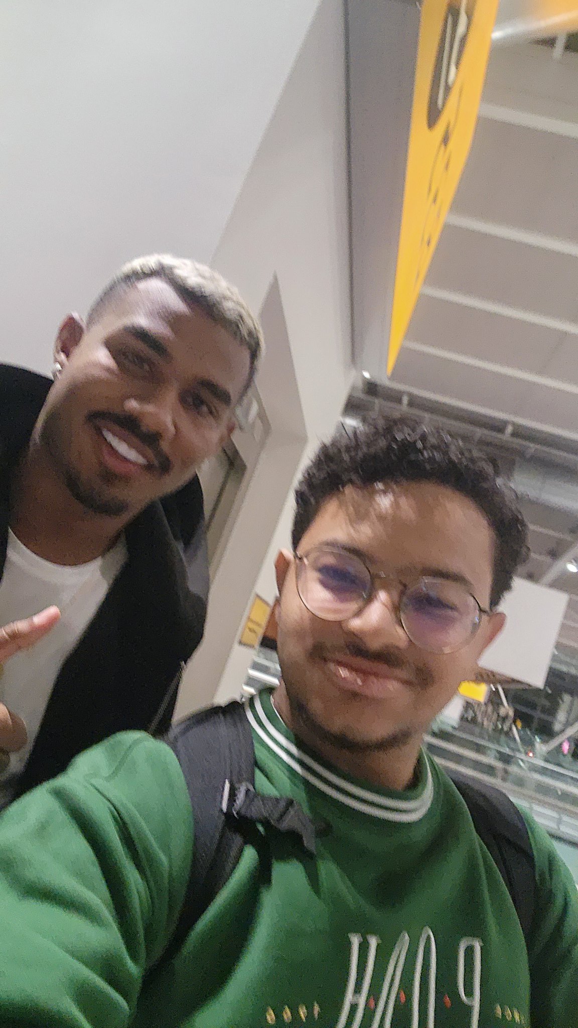 Vascaíno posa para foto com Cuiabano no aeroporto