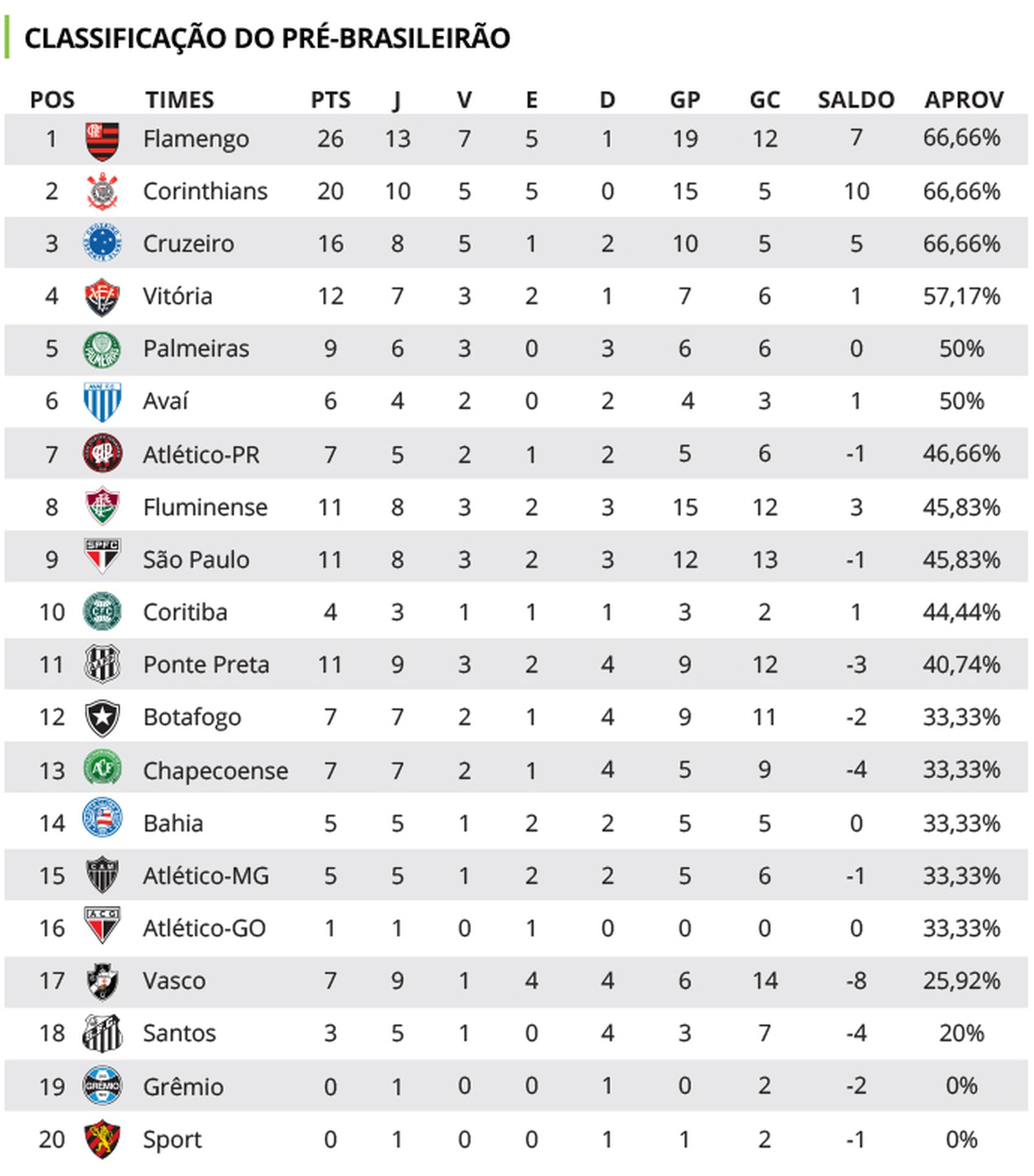 A porcentagem é a mesma de Corinthians e Cruzeiro, mas o Rubro-Negro carioca aparece em primeiro por ter mais pontos no total. Fechando o G-6 estão Vitória, Palmeiras e Avaí. Grêmio, Sport e Atlético-GO, com apenas uma partida disputada, são lanternas sem nenhum ponto. Foram computados jogos das seguintes competições: Torneio da Flórida, Primeira Liga, Paulista, Carioca, Mineiro, Baiano, Catarinense, Paranaense, Copa do Brasil, Libertadores e Copa do Nordeste.