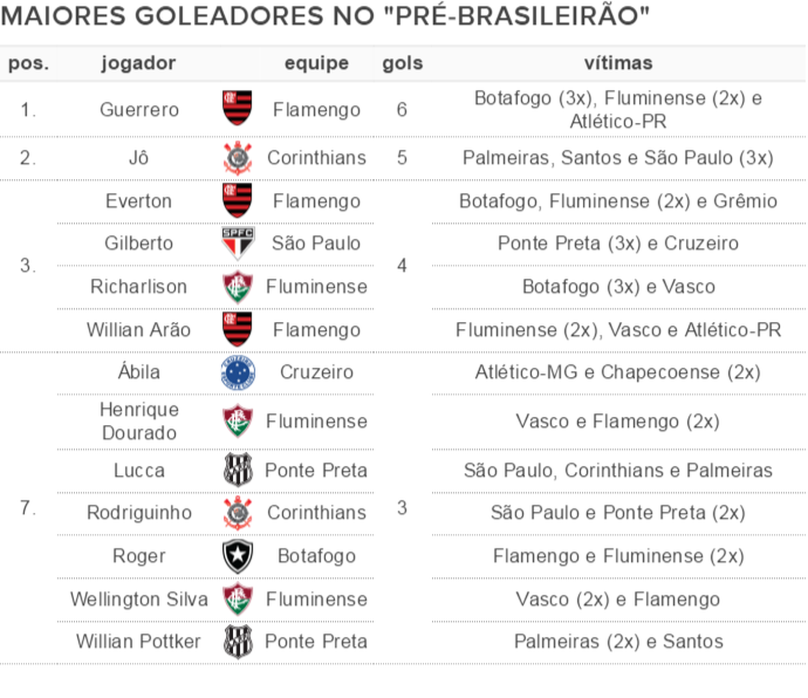 Além de liderar, o Flamengo também tem o artilheiro deste "Pré-Brasileirão": Guerrero, com seis gols marcados em partidas contra Botafogo, Fluminense e Atlético-PR. Jô, rei dos clássicos no Corinthians, vem logo atrás com cinco. Veja a lista abaixo: