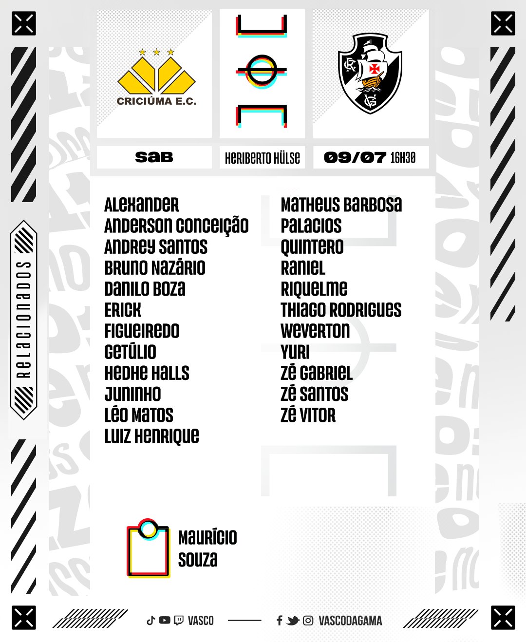Vasco divulga lista de jogadores relacionados para jogo contra o Criciúma