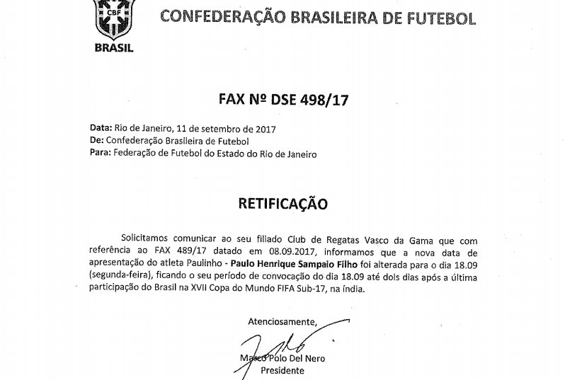 Vasco chegou a um acordo com a CBF para liberar Paulinho para a seleção sub-17. Ele se apresenta dia 18. #gevas