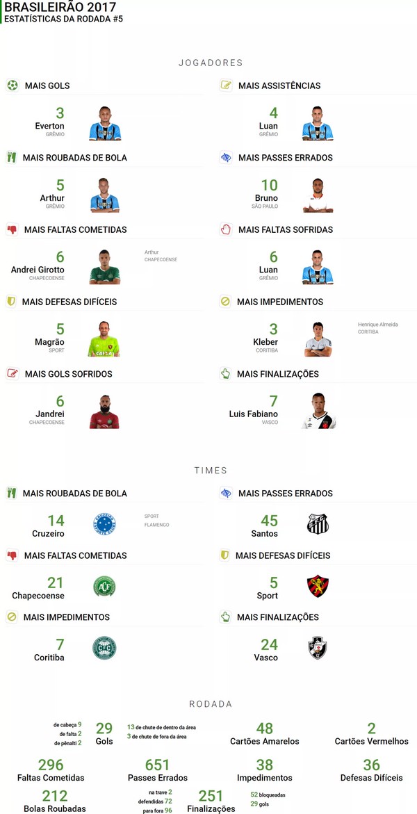 Quase que não acontece o jogo entre Chapecoense e Grêmio, adiado de quarta para quinta-feira por causa do fechamento do aeroporto em Chapecó e com os times viajando de ônibus para o oeste catarinense. Ainda bem que aconteceu, principalmente para as estatísticas da 5ª rodada do Campeonato Brasileiro. A vitória do Tricolor gaúcho, por 6 a 3, com três gols de Everton e incríveis quatro assistências de Luan, que acabou com o jogo na Arena Condá, são apenas as mais visíveis. Nas faltas, teve o sarrafeiro Andrei Girotto, da Chape, que cometeu seis infrações, e o próprio gremista Luan, que foi caçado e derrubados pelos adversários seis vezes. Arthur, revelação do time gaúcho, mostrou seu valor novamente com cinco roubadas de bola e boa atuação. Jandrei, goleiro da equipe catarinense, cansou de buscar seis bolas no fundo da própria meta. Noite pouco feliz para time e torcida da Chapecoense.