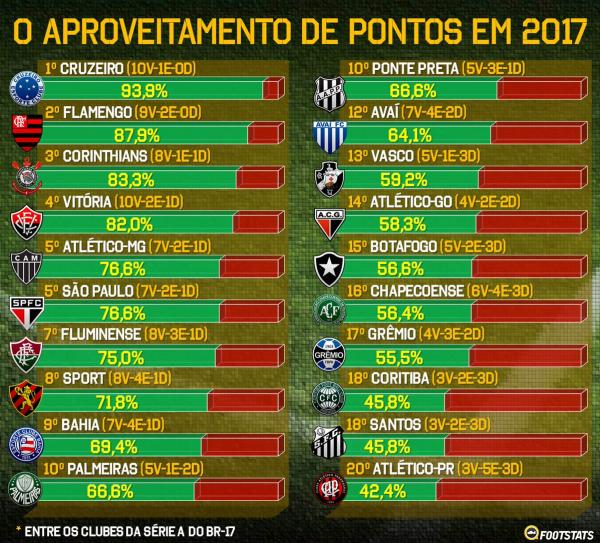 Pontos ganhos em relação aos disputados. O ranking de aproveitamento dos times da Série A em 2017 (Fora da lista, o Internacional tem 69,4%)