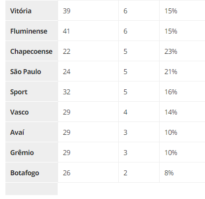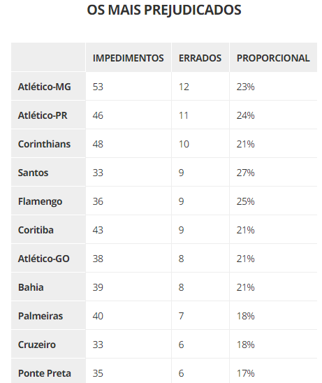 O clube com mais impedimentos é o Atlético-MG, com 53, que também tem o maior número de infrações mal assinaladas: 12. E, proporcionalmente, o Santos é o mais prejudicado: 27% dos impedimentos marcados contra o Peixe foram errados.