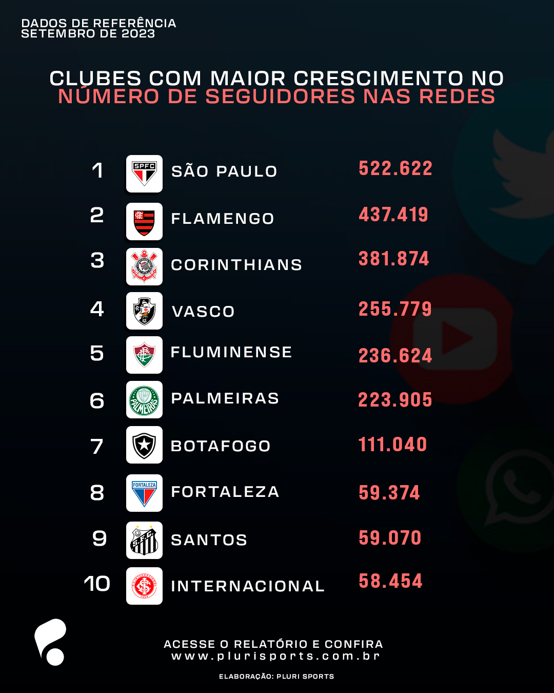 Pelo segundo mês consecutivo, o São Paulo mantém a liderança do ranking, com um acréscimo de mais de meio milhão de novos seguidores em seus canais digitais somados.
