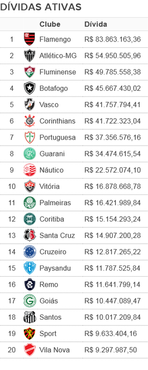 Em tempos de reforma da Previdência Social para conter o imenso rombo instalado nas finanças do país - da ordem, segundo o Governo, de R$ 450 bilhões - e discurso de aperto geral para o trabalhador brasileiro quanto às novas regras para aposentadoria, há uma parte que cabe nesse latifúndio causada justamente pela inadimplência daqueles responsáveis por uma das maiores paixões desse povo. Se os clubes de futebol procuram levar mais alegria no dia a dia dos contribuintes e suas famílias, esse custo-benefício anda doendo, e muito, no bolso. Nesta terça-feira, o "Redação SporTV", em matéria exclusiva do repórter Fred Justo, divulgou a extensa lista de devedores à União. Segundo levantamento da Procuradoria Geral da Fazenda Nacional, eles juntos acumulam débito de quase R$ 800 milhões. E o Flamengo, clube de maior torcida e apelo popular, aparece justamente como o maior vilão: o Rubro-Negro, hoje, tem uma dívida ativa astronômica de R$ 83.863.163,36 a ser quitada..