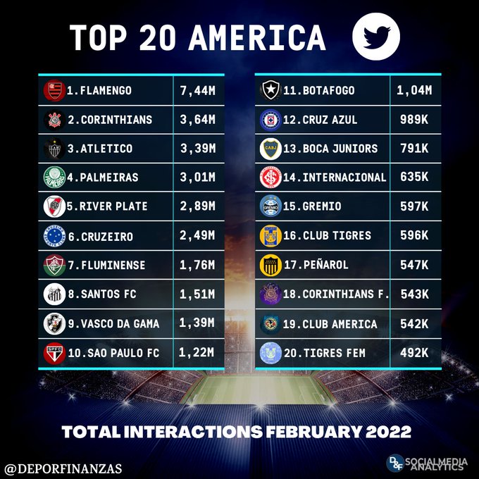 📲⚽¡Los 20 clubes de América con más interacciones en #twitter durante febrero 2022!🔃💙💬