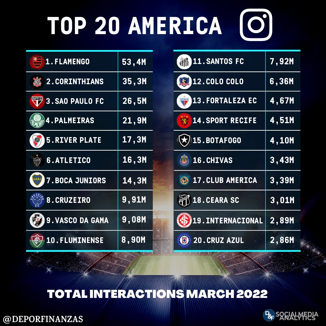 📲⚽¡Los 20 clubes de América con más interacciones en #instagram durante marzo 2022!💙💬
