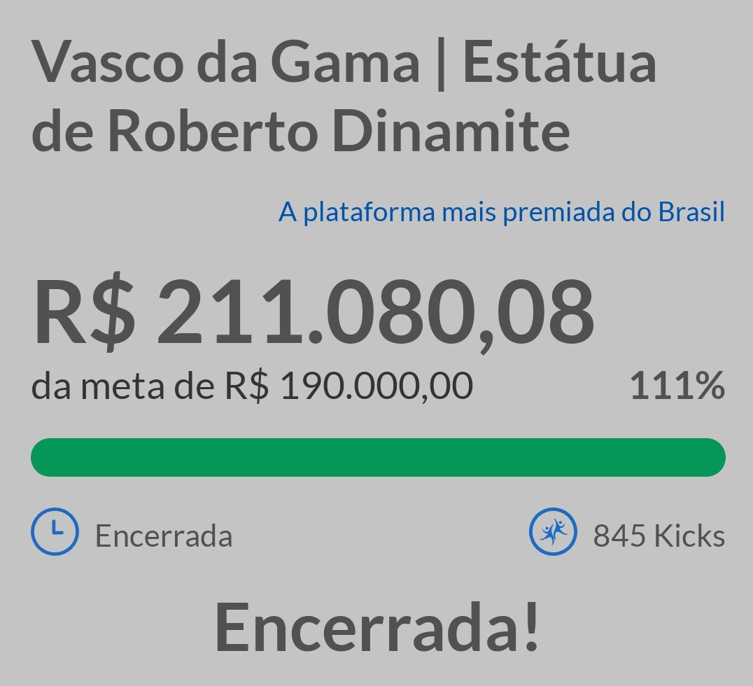 O clube encerrou o Kickante com 111% da meta: R$ 211.080,08 arrecadados em 5 horas. R$ 21 mil a mais.