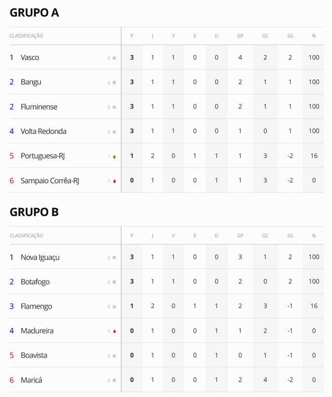 🔥Terminada a 1ª rodada da Taça Guanabara (fase de grupos do Campeonato Carioca), o Vasco, que derrotou o Maricá por 4 a 2, é o líder do Grupo A pelo critério do saldo de gols.