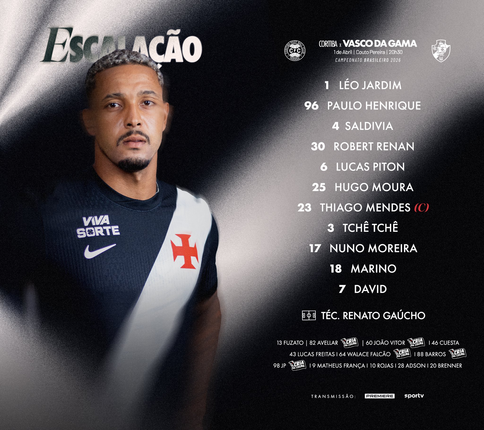 Vasco escalado para enfrentar o Coritiba