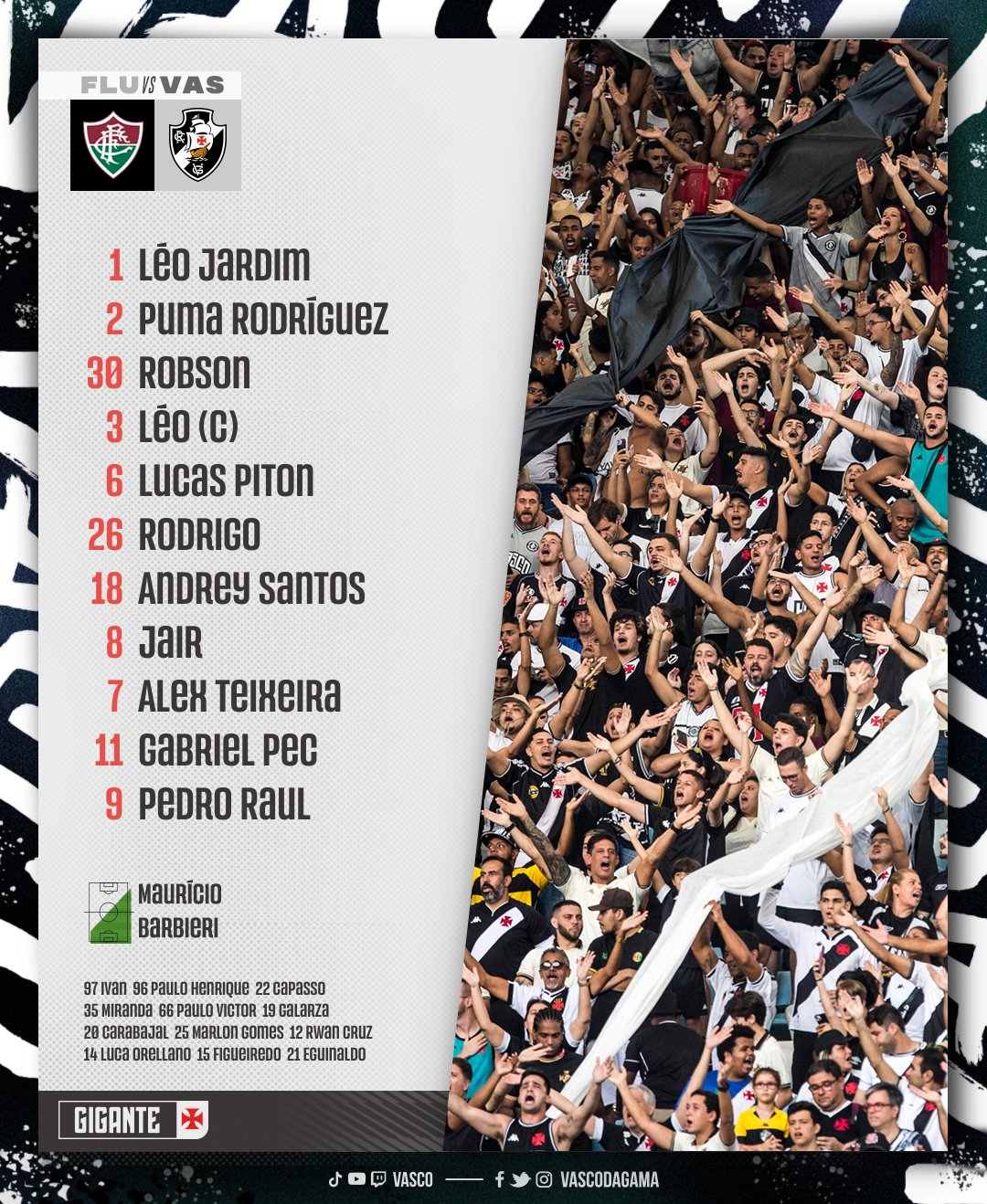 Vasco escalado para o clássico desta noite. 💢👊