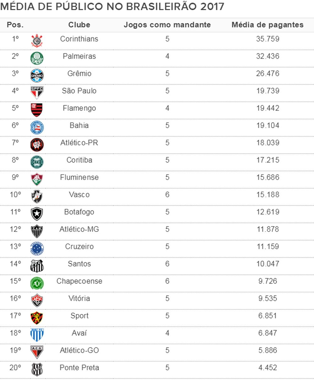 Das cinco partidas com maior presença de torcedores, o Timão está presente em quatro, sendo três como mandante e uma como visitante diante do Grêmio. Apesar do desempenho irregular neste início de Brasileirão (5V/1E/4D), o Palmeiras está na vice-liderança no ranking, com média de 32.436 espectadores nos quatro duelos que disputou em casa contra Vasco (33.425), Atlético-MG (34.240), Fluminense (33.066) e Atlético-GO (29.014).