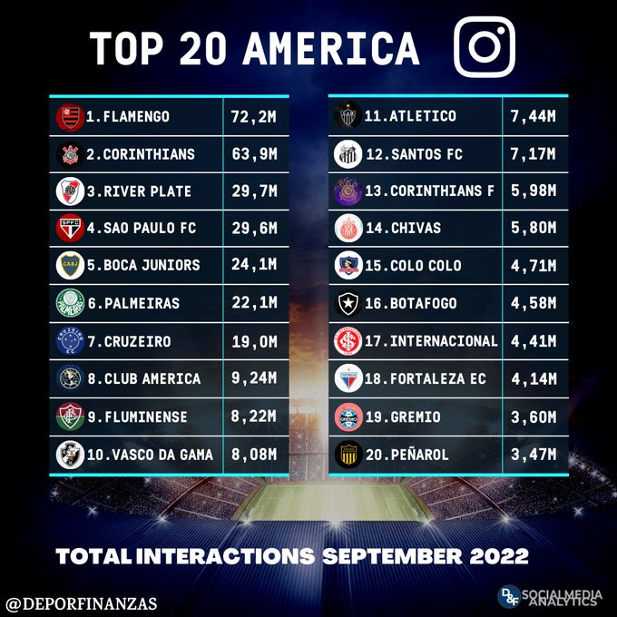 📲⚽¡Los 20 clubes de América con más interacciones en #instagram durante septiembre 2022!💙💬