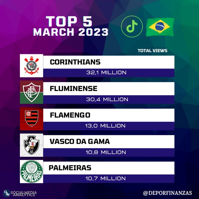 📲⚽🇧🇷 Os 5 clubes brasileiros com mais visualizações no #TikTok durante março 2023! 🕺🕺⏯