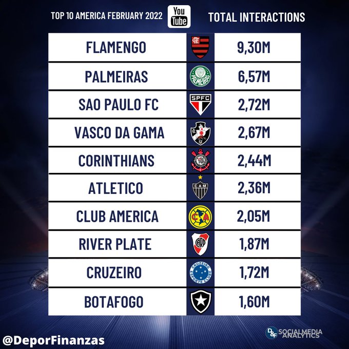 📲⚽ Most popular american football clubs on #youtube during february 22!