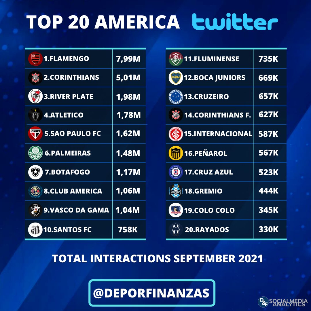 📲⚽ ¡Los 20 clubes de América con más interacciones en #twitter durante septiembre 2021! 🔃💙💬