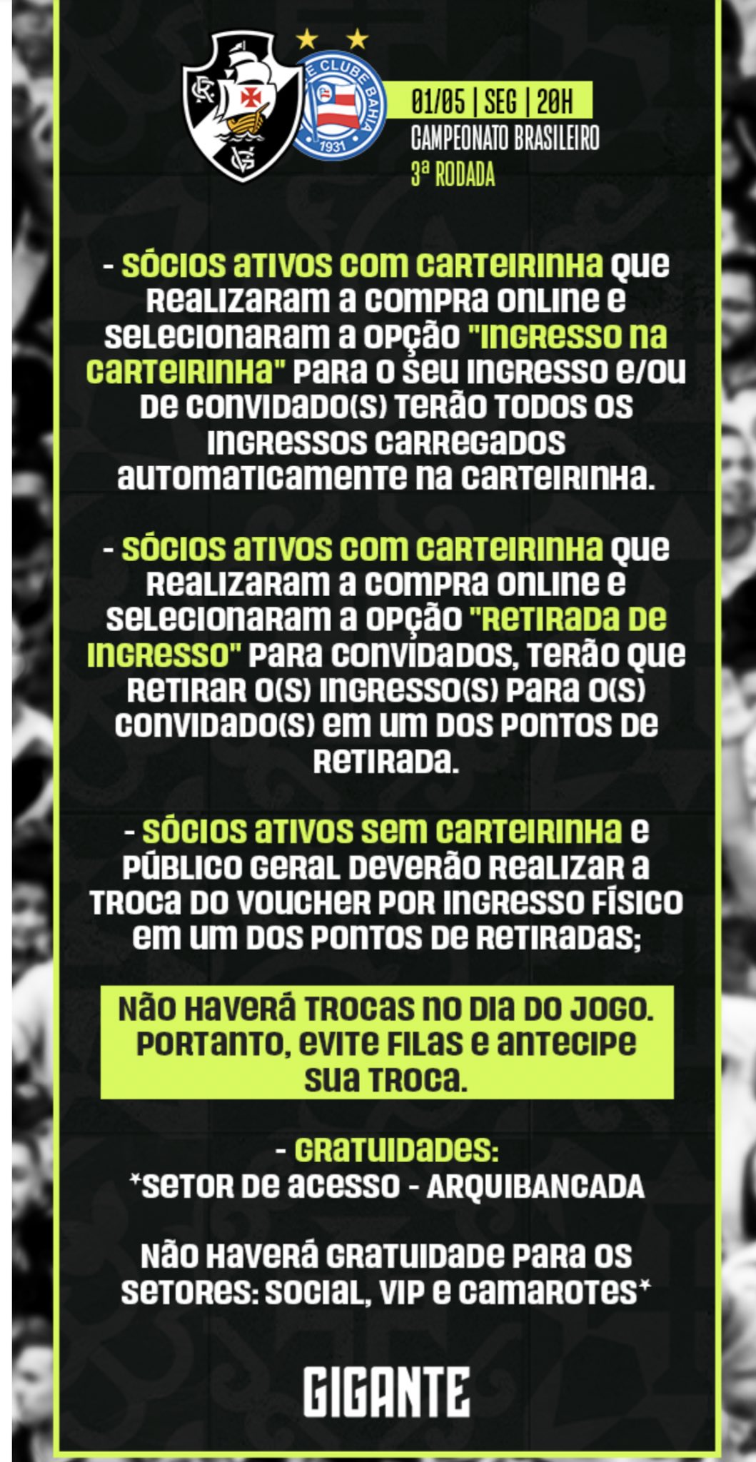 Quem comprou ingresso para o jogo de segunda-feira e precisa trocar o voucher, fique atento: o Vasco acabou de informar via e-mail que NÃO HAVERÁ troca de ingressos no dia do jogo.