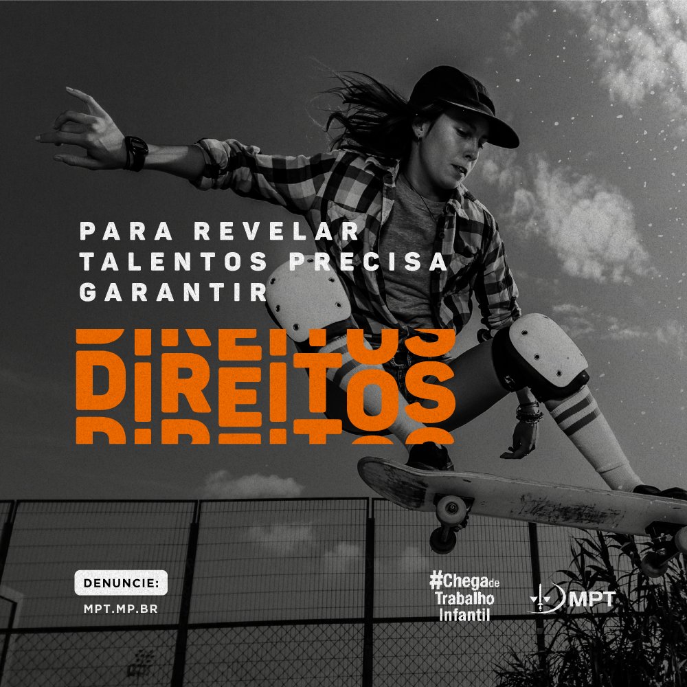 #MPT #ChegaDeTrabalhoInfantil #pratodosverem A foto mostra uma atleta fazendo uma manobra de skate, ela utiliza equipamento de proteção, como joelheiras. O título diz "Para revelar talentos precisa garantir direitos". Denuncie no site http://mpt.mp.br.