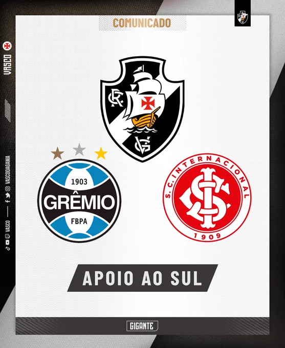 O Vasco da Gama se solidariza com as vítimas das enchentes após a passagem de ciclone no estado do RS e apoia as campanhas de @Gremio e @SCInternacional de arrecadações destinadas às cidades que precisam da ajuda de todos nós no momento.