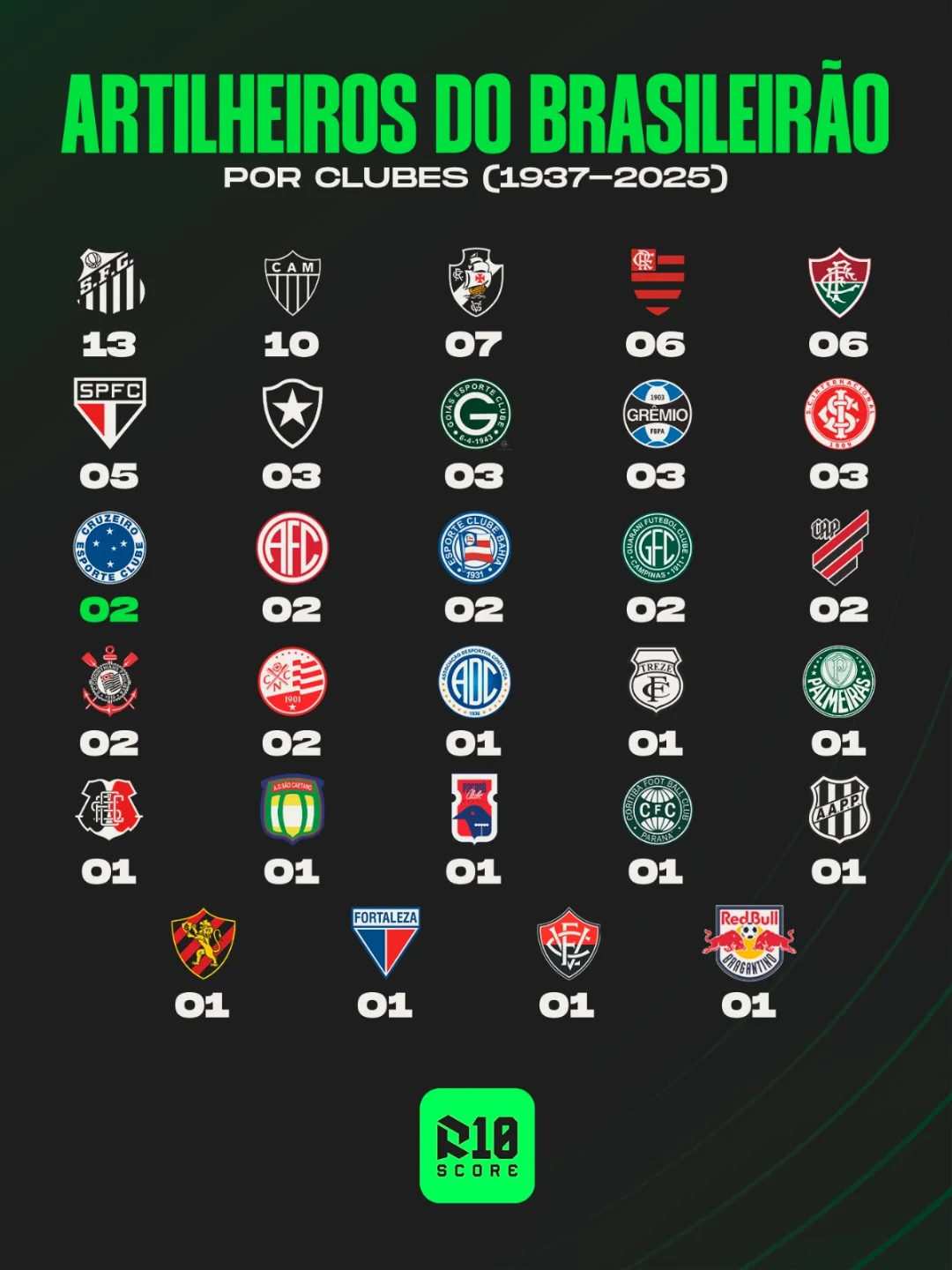 ARTILHARIA! Kaio Jorge se tornou o segundo jogador do Cruzeiro a terminar um Campeonato Brasileiro como artilheiro. Quantos artilheiros seu clube já teve na história da competição?