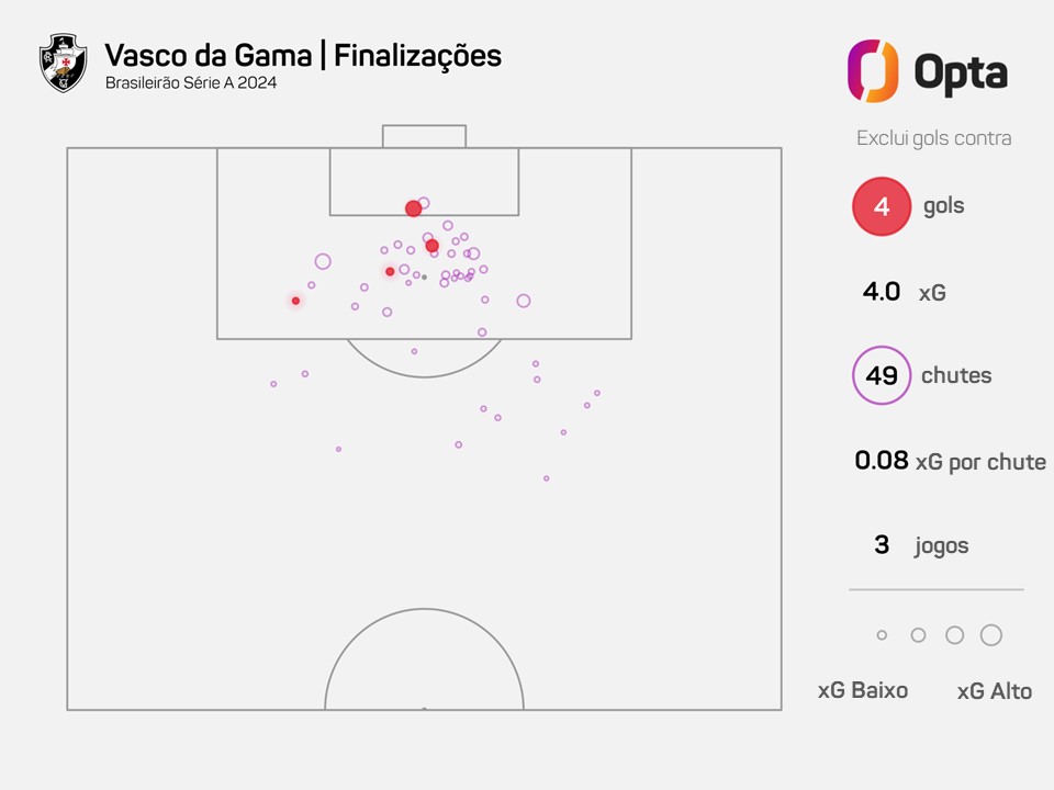 56% - O Vasco finalizou 36 vezes de dentro da área no Brasileirão Série A 2024, a maior marca da competição até o momento. No entanto, 20 desses disparos foram de cabeça (56%), porcentagem que só é superada por Palmeiras (56%) e Atlético Goianiense (67%). Aéreo.