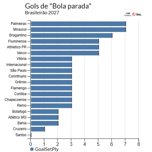 O gol marcado a partir de "bola parada" é a polêmica da temporada na Inglaterra. E aqui, neste início de brasileiro, quem tem usado mais essa arma? Mirassol e Palmeiras têm 7; Bragantino 6; Athletico, Fluminense e Vasco 5. O Santos é o único que ainda não marcou desta forma.