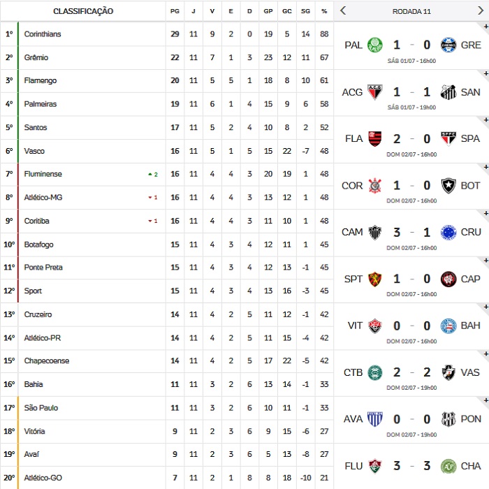 Veja a colocação do Vasco após 11 rodadas do Campeonato Brasileiro: